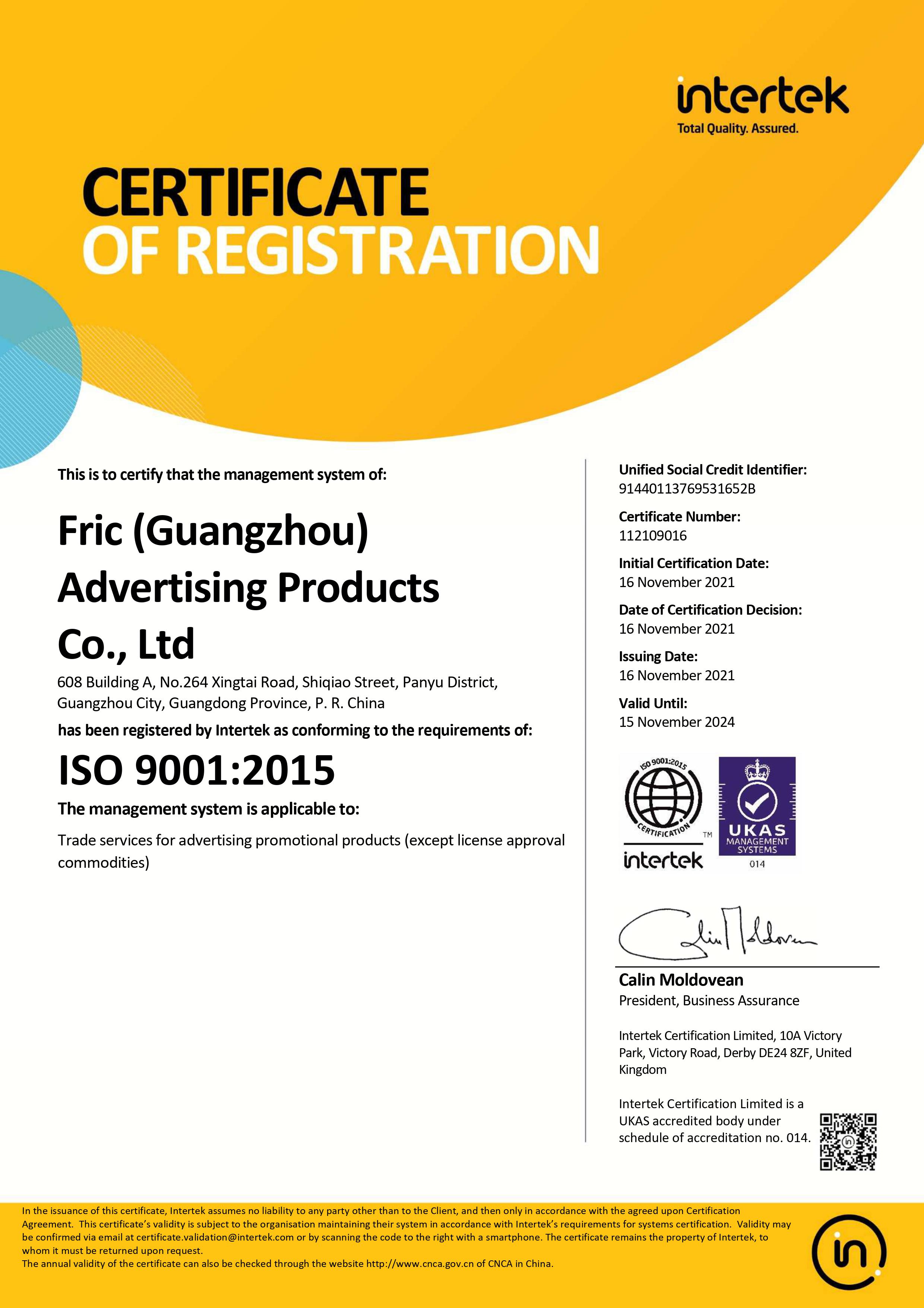 Para fornecer serviços de alta qualidade a todos os clientes com mais eficiência, a FRIC começou a fazer construção de gerenciamento padronizado a partir de 2008, mas não se candidatou à certificação no passado. A fim de atender aos requisitos de alguns clientes para documentos de certificado, a FRIC foi oficialmente aprovada na auditoria de certificação ISO9001 por meio do Intertek Group em 2021-11-06.